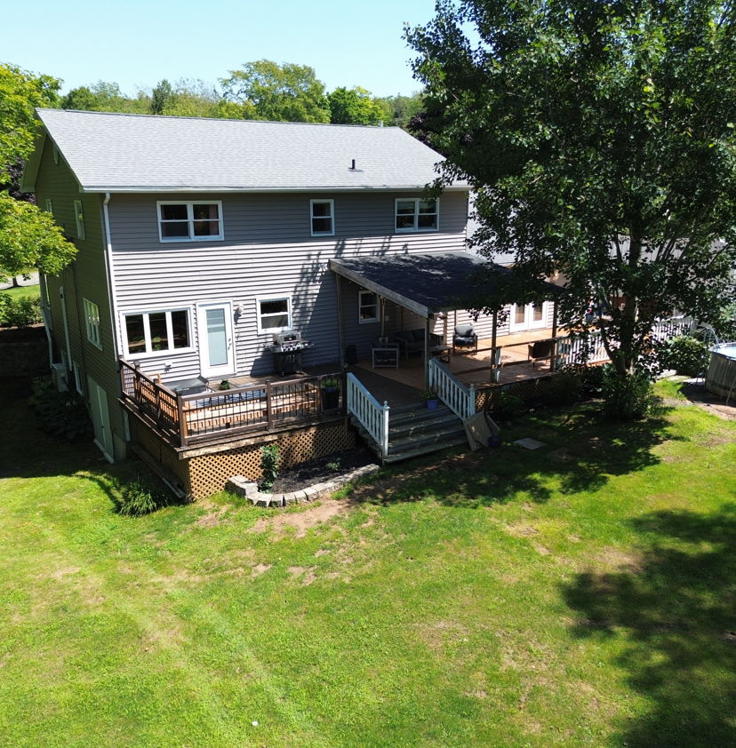 Outside, the property shines with a double paved driveway, an additional parking area, and an expansive 60x16 back deck—partially covered for comfort. On hot summer days, cool off in the above-ground pool and enjoy the serene outdoor space.